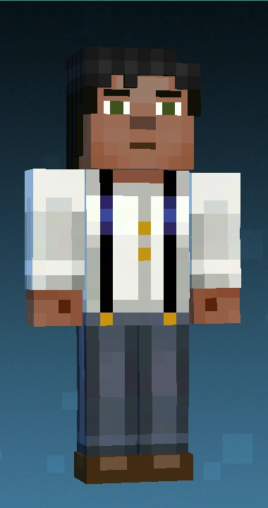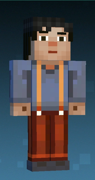 | M3 Jesse has rich, warm toned skin. He wears a white long-sleeved shirt, blue colored sleeves featuring white stripes, reddish-brown denim pants with the opening colored a brighter shade, secured by yellow suspenders and paired with dark dress shoes. He has pitch-black eyes, short-length jet black hair and a subtle blush across his cheeks. |